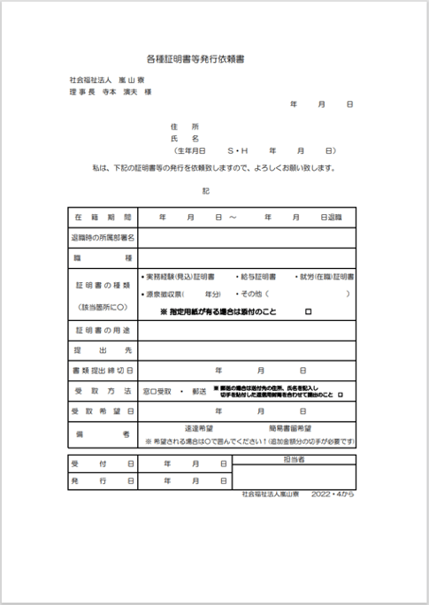 「各種証明書等発行依頼書(退職者)」を印刷のうえ必要事項を記入して下記住所まで郵送ください。